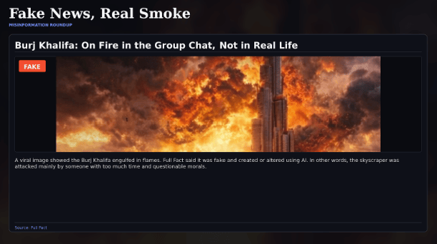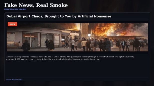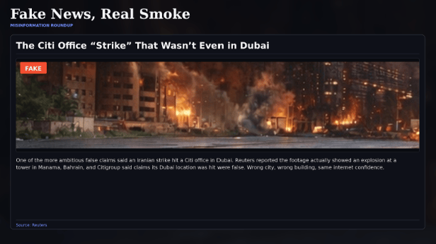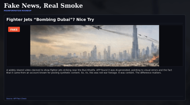 Other viral “proof” was not even new. Reuters found that one clip shared as an attack on “CIA headquarters” in Dubai was actually a 2015 apartment fire in Sharjah. AFP and other fact-checkers also traced fresh panic posts about a supposed strike on Dubai airport to older, unrelated fire footage. In other words, a lot of the internet is not reporting the war. It is cosplay with smoke effects.